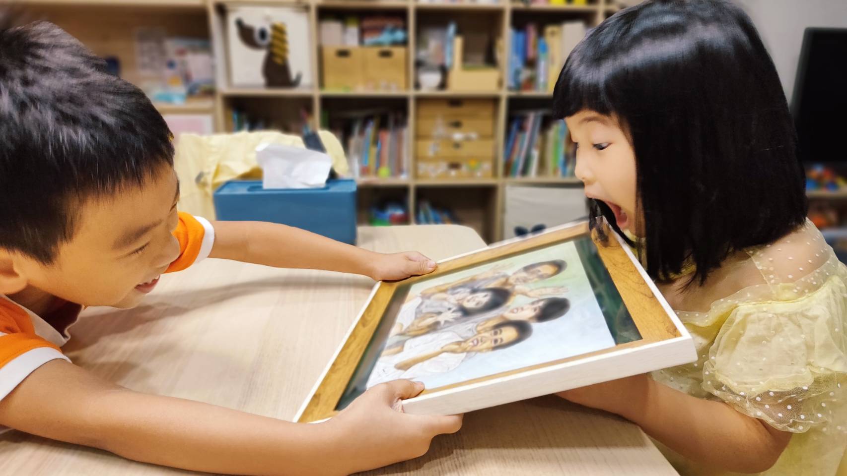 領取包裹的那一刻,我心中有一種很特別、說不出口的、很美好的感覺!在開箱時,兩個孩子們則是一陣驚奇!接著搶著欣賞畫作,並且在看著畫時,一人一句地發表自己的看法!