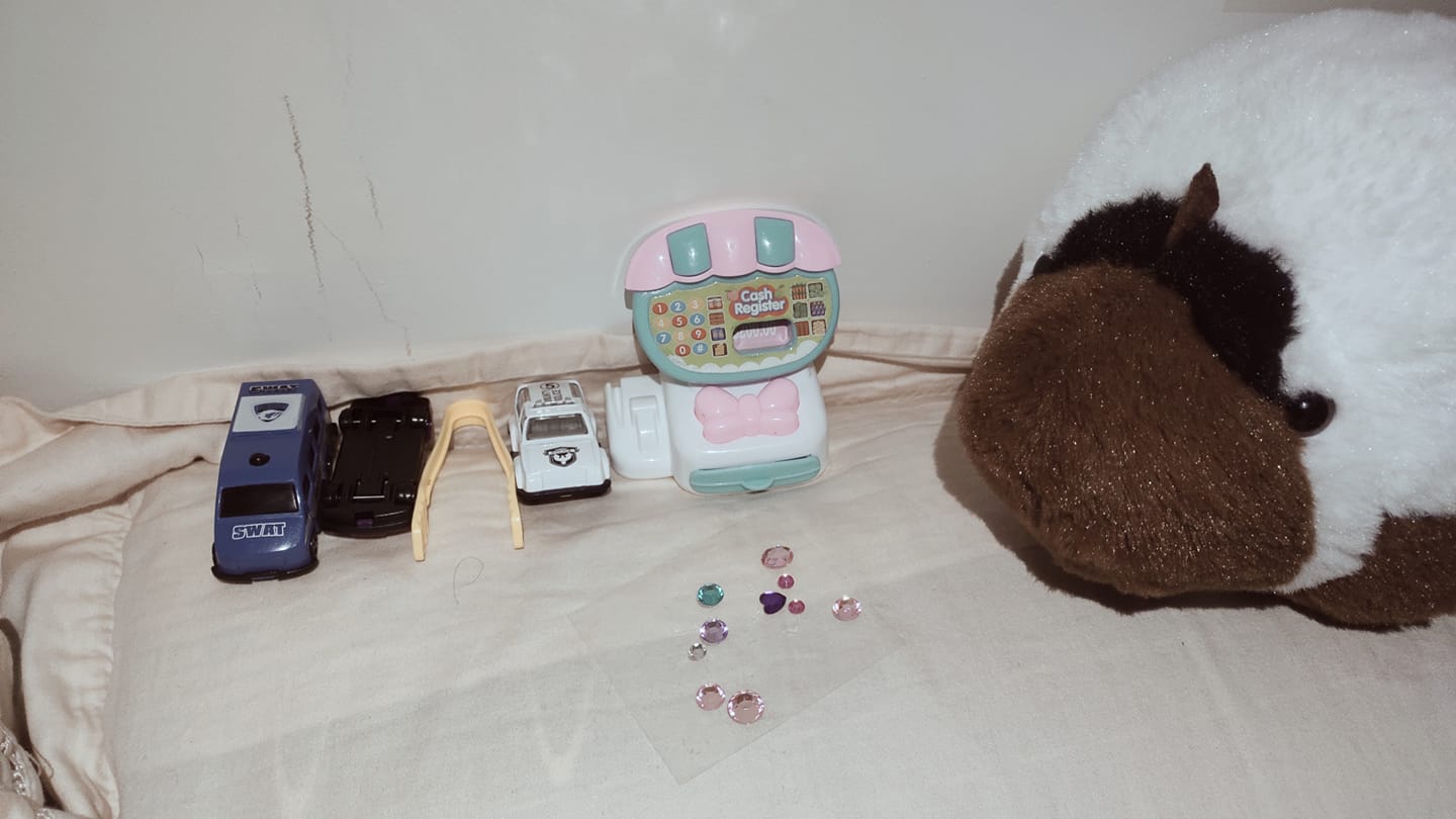 翎邊哭邊點點頭:「對…我剛才去客廳找玩具…嗚嗚…把玩具當成是爸爸媽媽…放在床上,假裝車車是爸爸和媽媽在陪我…」