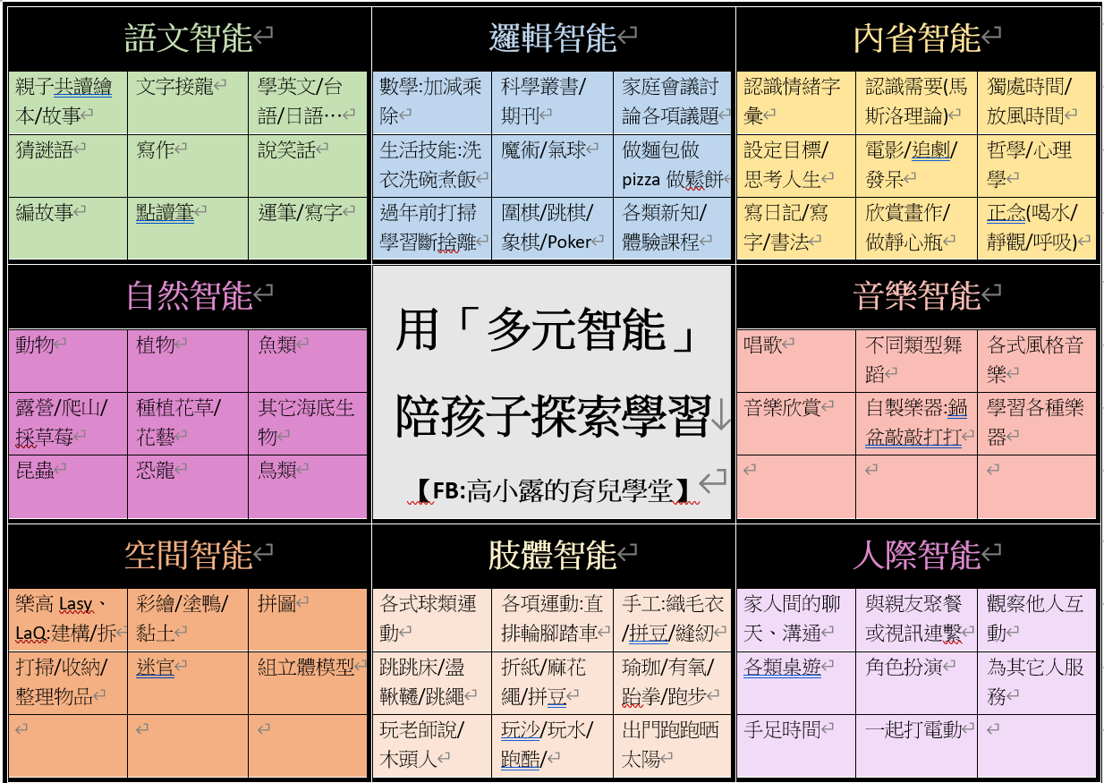 就按照了加德那的這八大智元,列出了這段期間我們可以嘗試著帶領孩子進行的學習與探索